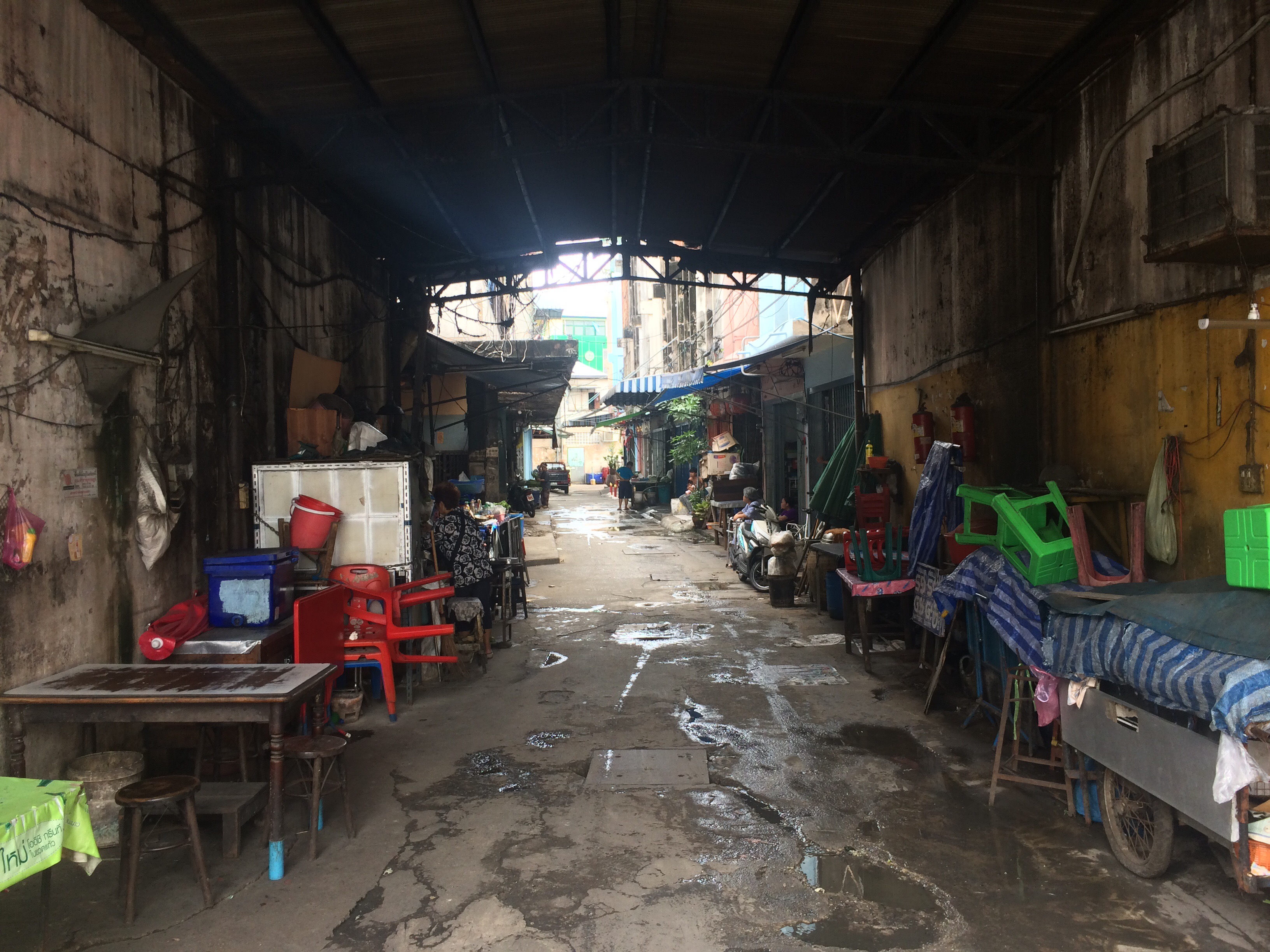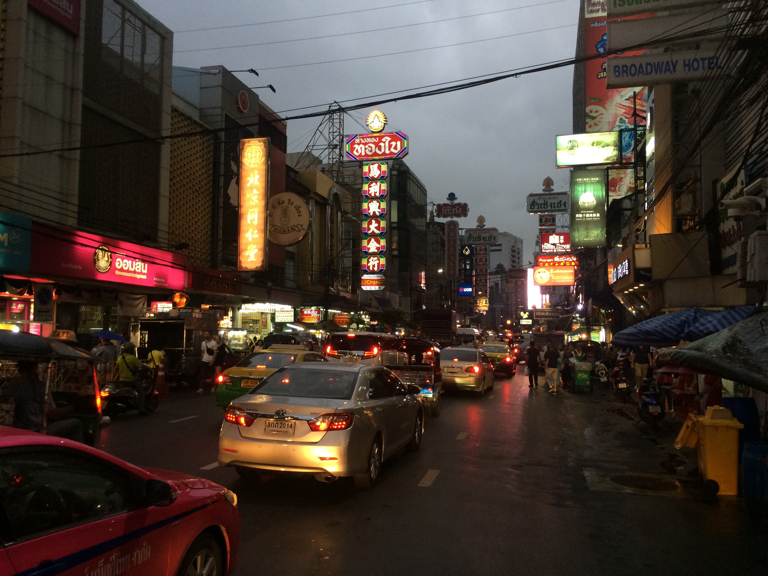 Erlebt und gesehen haben wir heute bereits eine Hand voll: den Golden Mountain (Wat Saket) inkl. 318 Stufen mit einem sagenhaften Ausblick über die Stadt, die Tempelanlage Wat Ratchanda einschließlich Andacht, ein TukTuk (3-Radwagen) sogar Chinatown konnten wir umtriebig machen. Und schließlich hatte ich endlich einmal mehr Gelegenheit mich als Pfadfinderin zu üben – ohne Internet und dem üblichen Navigationsgerät: stattdessen überdacht von Regenmassen vom Himmel mit der Karte in der Hand – alles um zurück zur Herberge zu finden… und – es ist geglückt. Ronja Räubertochter also habe ich doch noch nicht verloren. Was für ein Glück. „Glück“ – ein Begriff der mir hier fernab von Berlin, mitten in Bangkok obenhin ohne Vorwarnung spielerisch, fast dreist ins Gesicht springt und ruft: Lachen macht gesund, auch Dich. Man bzw. ich kann mich diesem sich aufdrängendem Gefühl gar nicht widersetzen; der Emotion nicht nicht aus dem Weg gehen. Das Glück, es lacht Dich trotz oder gerade wegen der ganz offensichtlichen Armut vor Ort an und nimmt Dich in seinen Bann. Es ist wohl ein Privileg Europäerin zu sein, eines welches ich allzu oft abstreifen möchte. Geht es uns so gut wie seit vielen Jahrzehnten nicht mehr, komme ich trotzdem nicht umhin, mich ständig mit Nörgeleien konfrontiert zu sehen. Vor allem oft von eben jenen, die oftmals keinerlei oder nur marginalen Output zu den Sonnenseiten unserer westlichen Gesellschaft beitragen. Hier gestaltet sich der Habitus eben doch anders. Glück jedenfalls ist ein Wort, welchem ich in den kommenden Tagen zumindest ansatzweise ein wenig Rechnung tragen möchte. Liegt es nun an meiner Wahrnehmung oder an dem Gestus der hier lebenden Menschen – Bangkok ist voll davon. Versuche ich doch mal ein wenig davon zu kosten…..