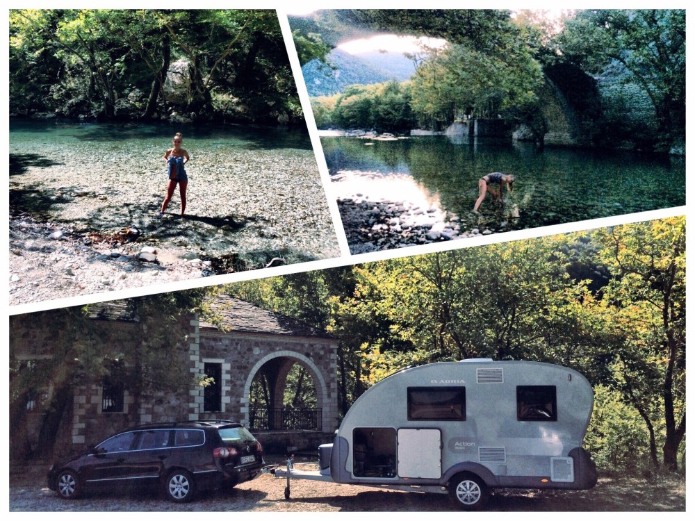 Die vergangene Nacht haben wir an einer prähistorische Brücke (bitte so im Navi eingeben: Stellplatz an der historischen Brücke) in der griechisch-albanischen Grenzgebiet übernachtet. Unser Kanu haben wir noch nicht ausgepackt. Die Brücke wurde vor über 9500 Jahren erschaffen und ist immer noch erhalten. Ein gradioser, kleiner Platz mitten im griechischen Gebirge. Gestern Abend im Lummerland, heute Morgen umgeben von einer viel befahrenen Raftingstrecke. Immerhin war ich in dem eiskalten Fluss heute morgen kurz baden.